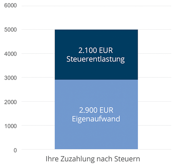 Und auch die einmalige Zuzahlung von 5.000 Euro kann wie die laufende Investition steuerlich voll abgesetzt werden. Das heißt, Sie zahlen nach Steuern effektiv nur 2.900 Euro.